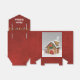 Casinha de pão-de-gengibre em neve com nome de família na porta. Plano de fundo vermelho. O nome pode ser editado.
