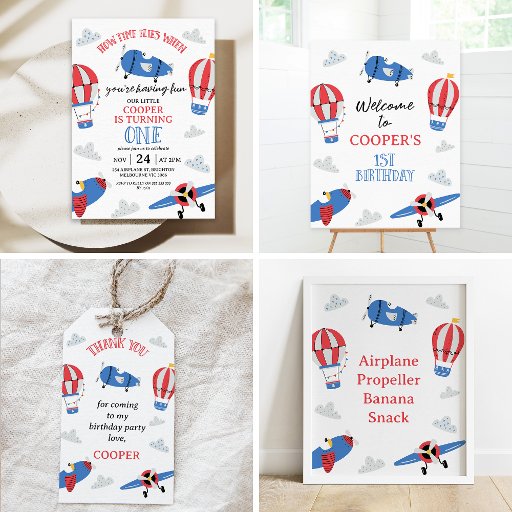 Plano Vermelho Azul Moderno Como o Tempo Voa primeiro aniversario Favorece Box Como o tempo voa na primeira caixa de favoritos de aniversário para o garoto com dois aviões, balões de ar quente e nuvens. Essa caixa de primeiro aniversario é ideal para um avião de festa de aniversário temática de voo. A foto está atrás.