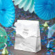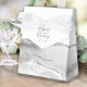 Esta elegante caixa de favores moderna apresenta uma cinza e uma cor branca de água agada design aparada com cintilação de prata. Personalize-o com os nomes do casal no roteiro de cinza de carvão sobre uma grande seringa de cinza pálida e em fundo branco, juntamente com a data do casamento abaixo.