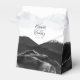 Esta elegante caixa de favores moderna apresenta uma design de agata preta, aparada com cintilação de prata. Personalize-o com os nomes da noiva e noiva em um guião de escrita de cinzas de carvão sobre uma grande seringa de cinza e em um fundo branco, juntamente com a data do casamento abaixo.