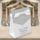 Elegante primeira e sagrada caixa de favores com esteira de prata com nome personalizado e data especial definida na tipografia de prata-chica. Você também pode personalizar com seu próprio obrigado sua mensagem sob a tampa. Uma maneira perfeita de dizer obrigado aos seus hóspedes! Projetado por Thisnotme©