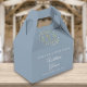 Elegante caixa de favores florais sagrados da primeira comunhão com uma cruz verde-loula e dourada com seus detalhes de eventos, mostrados em tipografia chique sobre um fundo azul empoeirado. Você pode personalizar com seu próprio obrigado sua mensagem ao contrário. Uma maneira perfeita de dizer obrigado aos seus hóspedes! Projetado por Thisnotme©