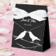 Dois corvos elegantes tocados num galho são a forma perfeita de celebrar o seu casamento gótico. As silhuetas de aves brancas estão contra um fundo preto contrastante. Também excelente para um casamento de Halloween.