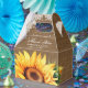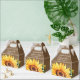 Coloque seus presentes de chá de panela/casamento nessas caixas florais românticas de favores florais com girassol em um fundo de burlap adornada com rendas florais brancas e luzes de cordas.