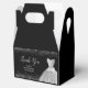A beautiful silver themed elegant watercolor dress gown on a black background with faux glitter at the top and bottom of the favor box.