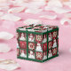 Neves bonitos em chapéus e lenços, entremeados com flores brancas e galhos em fundo verde, cria uma colagem divertida que é perfeita nesta caixa de presentes de Natal.