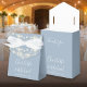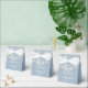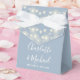 Caixa de favoritos empoeirada de casamento azul com luzes bonito de cordas, nomes de script de assinatura de na moda e data especial definida na tipografia moderna. Você pode personalizar com seu próprio obrigado sua mensagem sob a tampa. Uma maneira perfeita de dizer obrigado aos seus hóspedes! Projetado por Thisnotme©
