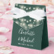 Caixa de favoritos de casamento verde esmeralda elegante com luzes bonito de cordas, nomes de script de assinatura na moda e data especial definida na tipografia moderna. Você pode personalizar com seu próprio obrigado sua mensagem sob a tampa. Uma maneira perfeita de dizer obrigado aos seus hóspedes! Projetado por Thisnotme©