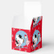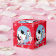 Vacas brancas e pretas vestindo chapéus de Papai Noel em uma caixa vermelha com flocos de neve. Uso para presentes de favoritos para festas.