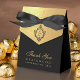 An elegant black and gold wedding favor box. The flap is faux gold foil and it has a black crest with the wedding monogram in it, from the two initials of the bride and groom.