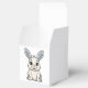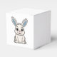 Vector illustration of a smiling white bunny with large, sweet eyes, long, blue ears, and a pink nose, in a cartoon style, on a black background. Suitable as a logo or mascot.