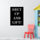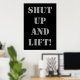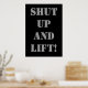 Uma poster preta e cinza, com a frase "SHUT UP AND LIFT!" escrita nela. Um deve ter poster para qualquer um que leve seu treinamento a sério! Levantamento de peso, exercício, academia, motivação.