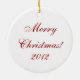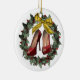 Calçado vermelho-estiletto com dentro de coroa com arco de ouro personalizado ornamento cerâmico de dois lados! Um ornamento na moda para a garota que ama seus estilettos e calçados! Este ornamento bonito apresenta um par de calçados de ponta-rosa, pendurados dentro no meio de uma coroa de morango oca, acentuados com um arco ouro no topo. Na parte de trás do ornamento lê-se "Feliz Natal" e o ano, ambos podem ser alterados por você na área de fácil utilização do modelo nesta página. Para mais cores e estilos de ornamentos de calçados, visite nosso compro!