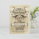Convites de festa de noivado russa com botas de cowboy, tipografia ocidental, fundo de madeira de celeiro e ferradura no centro. Para a Noiva e o Groom em calçados de vaqueiro! Divirta-se muito na sua festa de noivado!