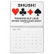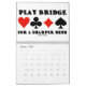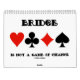 Os jogadores da ponte avid desfrutarão deste calendário com os quatro trajes de cartas junto com uma ponte diferente dizendo a cada mês em 20XX, além de uma ponte bônus dizendo design no cobrir traseiro. A ponte clássica diz que muitas vezes são ouvidos na mesa da ponte num clube ou num torneio de ponte. Palavras e palavras não- palavras do excelente 20XX Classic Bridge Sayings presente no calendário para qualquer ponte séria/jogador de ponte duplicado, independentemente da classificação!