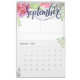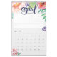 Este calendário de cores d'água feminina apresenta um calendário mensal de 12 páginas (ou 24 se você selecionar essa opção) você pode personalizar o texto e também o estilo da grade de calendário abaixo, ele também inclui uma seção para organizar tarefas ou metas para o mês, uma área de anotação e também uma área designada para uma cotação para inspirá-lo durante o mês. Cada página apresenta uma adorável peça escrita com mês e flores a aquarela e verde-verde. Você pode personalizar o cobrir frontal com o ano e seu texto personalizado, assim como o verso para tornar este lindo calendário de 2019 seu próprio calendário.