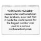 De " o NÚMERO GRAHAM," nomeado após o matemático Ron Graham, é tão vasto que guardara o recorde mundial para o número o maior usado nunca em uma prova matemática séria. O número de Graham é muito maior do que outros grandes números tais como um googol e um googolplex. De facto, o universo perceptível é demasiado pequeno distante para conter uma representação escrita do número de Graham.