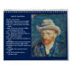 Este calendário exibe 14 pinturas do artista excelente holandês Vincent van Gogh, produzidas entre 1886 e 1890. Ele lista as pinturas e a data produzida no cobrir traseiro para facilitar a referência. É um presente perfeito para qualquer amante de arte. Antes de comprar, não se esqueça de personalizar a data e role para selecionar todas as opções preferidas (por exemplo, Feriados, Tamanho, Cor de vinculação, etc.). Vincent Willem van Gogh (1853-1890) foi um pintor holandês do Posto Impressionista que está entre as figuras mais conhecidas e influentes da história da arte ocidental. Em pouco mais de uma década, ele criou cerca de 2100 obras de arte, a maioria delas nos últimos dois anos de sua vida. Seus trabalhos incluíam naturezas-mortas, paisagens, retratos e autorretratos. Seu uso de cores ousadas e bruxaria dramática contribuiu para o aumento do expressionismo na arte moderna. Durante sua vida, apenas uma das pinturas de van Gogh, O Vineyard Vermelho, foi vendida.