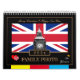 Calendário (modelo): Crie a sua família fabulosa/calendário fotográfico ajustando facilmente o modelo pré-fabricado da frente/traseira e escolhendo as suas próprias fotos para cada mês. Outra personalização com o upload de várias fotos, alteração de cores ou adição de texto pode ser feita em "Editar Design". Frente está apresentando a bandeira britânica - o Jack da União com símbolos de torre de relógio Big Ben do Reino Unido.