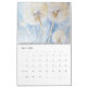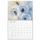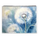 O calendário apresenta flores de dandelion em vários palcos de floração no estilo vintage/rustic. As flores são representadas em tons de azul, branco e amarelo e colocadas sobre um fundo azul macio.