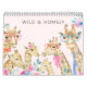 Ilustração Watrcolor de famílias animais de girafas, elefantes, veados, animais da floresta, aves, leões, pinguins, flamingos e ursos panda gigantes. Tema "Wild and Homely".