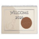 This minimalist cat-inspired desk calendar template features warm beige tones, a modern brown circle accent, soft line art of a cat, and a touch of silver for a polished, contemporary look. Perfect for cat lovers, minimalists, and anyone who enjoys clean, warm aesthetic designs on their desk.