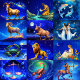 Calendário em doze ilustrações originais dos sinais astrológicos do Zodíaco, com céu azul profundo, estrelado