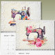 Calendário de costura de paredes temáticas cheio de belas ilustrações de máquinas de costura de safra e de cachos de flores. Apresenta uma imagem de estilo de aquarela exclusiva para cada mês, mais cobrir e traseiro. O cobrir frontal pode ser personalizado com seu próprio texto.