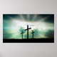 A alegria da ressurreição de Jesus Cristo é belamente representada nesta dramática foto azul e negra das cruzes em Calgary, iluminada de trás para o sol ascensão, com nuvens no céu e belos raios de luz iluminando a Cruz. Faz um poster excelente para Páscoa, ou o ano inteiro.