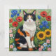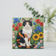 Um gato calico giro parado em papoilas vermelhas, íris azul e girassóis amarelos feitos em um estilo bonito de arte popular. Um trocadilho de gato bonito, "um dia de pata."