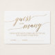 Esta elegante caligrafia dourada e floral quantas cartas de beijos são uma atividade divertida para um chá de panela de outono. Encha um frasco com os Kisses de Hersey e faça seus hóspedes adivinharem quantos doces estão no frasco. A resposta mais próxima ganha um prêmio! A design apresenta uma tipografia de folha de ouro falso, romântica e caprichosa, com um buquê lindo de flores rosa-pincel, marsala e burgundy nas costas. Nota: Este design não apresenta folha de ouro real. É um gráfico de alta qualidade feito para se parecer com folhas de ouro.