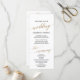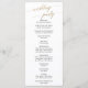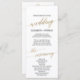Este elegante programa de festa de casamento de ouro para caligrafia é perfeito para um casamento simples. A design de folha de ouro falsa apresenta uma carta minimalista decorada com tipografia romântica e caprichosa. Inclua o nome da noiva e do noivo, a data e o local do casamento, a mensagem do obrigado, a ordem do serviço, a festa noiva e um memorial "em memória amorosa" opcional. Nota: Este design não apresenta folha de ouro real. É um gráfico de alta qualidade feito para se parecer com folhas de ouro.
