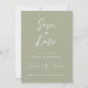 Nossa na moda para salvar a data do casamento é perfeita para sua celebração de casamento minimalista e elegante. Um belo emparelhamento de fontes brancas de caligrafia com texto simples e limpo em um fundo verde sábio faz um olhar elevado para complementar seu evento de na moda. Fácil e rápido personalizar-se com seus próprios nomes e detalhes do evento de casamento.