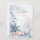 Uma fonte escrita à mão, combinada com um serif sans moderno, é usada nesta coleção de papelaria floral para estabelecer um tom quente e íntimo para o seu casamento. O convite mostrado aqui apresenta flores e folhagem em tons de azul empoeirado a branco-rosa suave contra um fundo de salpicos sonhosos de tinta aquosa. Procure ID771 para ver outras peças e opções de cores para este conjunto.