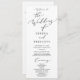 Essa delicada caligrafia negra, o casamento do programa é perfeito para um casamento moderno. A design romântica minimalista apresenta uma magnífica e elegante tipografia negra num fundo branco com um aspecto simples e limpo. Inclua o nome da noiva e do noivo, a data e o local do casamento, a mensagem do obrigado, a ordem do serviço, a festa noiva e um memorial "em memória amorosa" opcional.