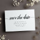Cartões salve a data simples e elegantes notifiquem seus convidados do seu próximo casamento no estilo do eterno. Cartões brancos nítidos apresentam "salvar a data" em letras de escrita de caligrafia, com seus nomes, data de casamento e local abaixo no tipo clássico de serifa negra. Adicione informações adicionais, como o site do seu casamento, ao verso em letras brancas em um fundo preto contrastante.