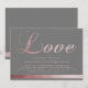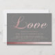 Convite para caligrafia elegante e na moda simples com torção de rosa dourado. Layout moderno com o script personalizado "love" em rosa gold com a letra moderna para todas as informações e rosa dourada na parte inferior de um fundo de cinza