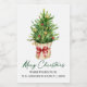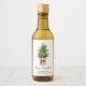 Modern Elegant Calligraphy Ink Script Merry Christmas Mini Wine Bottle Label includes a Watercolor Pine Tree in a paper bag with a Red Ribbon Bow, Gold and Red Christmas Ornaments.