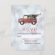 Uma placa RSVP com um design de natal fofo. Imagem é um belo caminhão de brinquedo com a mão Feliz de Natal pintada ao lado com a inscrição dourada. Carregando uma árvore de Natal decorada nas costas. O fundo é um padrão prateado.