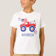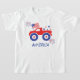 A camisa perfeita de 4 de julho para um garotinho! Um caminhão monstro vermelho com uma bandeira americana acenando da frente e estrelas azuis e vermelhas na parte de trás. Há também texto abaixo do caminhão que diz "América", mas isso pode ser alterado para o nome do seu filho ou qualquer texto que você escolher.