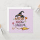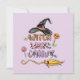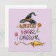 Cartão de saudação de Halloween com chapéu de bruxa, vassoura voadora e doces coloridos. Mistura perfeita de fofos e assustadores para amantes de truques ou de tratos. Excelente para festas de Halloween, amantes de doces e diversão feia.