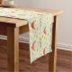 Este fabuloso corredor de mesa de padrões de meio século apresenta bumerangas, fogos de artifício, grandes estrondos e diamantes em laranja queimada, azul de turquesa, rosa, bronzeado e preto, num fundo amarelo creme. Ideia de uma sala de jantar muito engraçada!