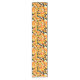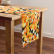 cobrir de mesa de mesa de Runner e acessório de decoração de casa com a ilustração de trabalho de arte de padrão sem costura Halloween Candy Corn, do TheFabricSeal, em Zazzle.com, é preenchido com doces em forma de pirâmide, deliciosos e brilhantes, com bandas de cores em tons de paleta de cor laranja brancos, amarelos e de abóbora. As cores tradicionais do milho doce representam as cores da colheita do outono, o milho no berço, com a extremidade grande da banda amarela parecendo com um kernel de milho. Este doce clássico é conhecido por ser o doce mais contencioso do Halloween.