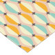 Symmetrical retro pattern with interlocking teal, yellow, and orange shapes on a beige background. Black star-like accents add contrast, creating a vintage feel.