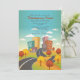 Um belo convite de Ação de Graças com céu azul, folhas de outono nas árvores e uma estrada para a cidade.