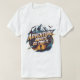 "Aventura Aguarda, Vai Encontrá-Lo." Use tipografia ousada e aventureira com bordas afiadas e angulares, dando ao texto um sentido de movimento e entusiasmo. Envolva a frase com elementos vibrantes e contrastantes como picos de montanha agitados, um rio que flui através do design, e uma grande e detalhada camada de bússola com bordas brilhantes para a atenção do desenhar