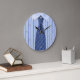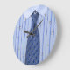 Um relógio de parede novinho, com uma camisa e gravata listradas.