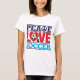 Diga todos o que é importante, especialmente futebol. As palavras "paz, amor e futebol" são soletradas para fora nesta camisa. Uma bola de futebol parece no coração representar o "O" no "amor" quando um sinal de paz tomar o lugar do "C" na "paz". Disponível com produtos de harmonização.