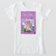 A camiseta de uma jovem com uma anime rosa sentada no chão com flores roxas e borboletas.