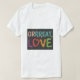A t-shirt apresenta a frase "Grande Amor" num design de multicores lúdico. Cada letra se rompe com uma tonalidade vibrante diferente, criando uma sensação de diversão e energia. Os "Rs" são as estrelas do show, com uma fonte ousada, levemente amordaçada que enfatiza o rosnado lúgubre em "Grrreat".